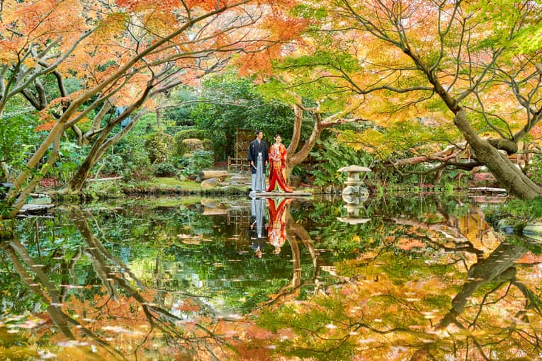 気候が比較的穏やかで晴れる日が多い秋は、前撮りでも人気のシーズン。日本庭園の紅葉は、11月下旬から12月初旬にかけて見頃を迎えます。秋の風情漂う中、ご家族や大切な方々と過ごす時間は鮮やかに心に刻まれることでしょう。